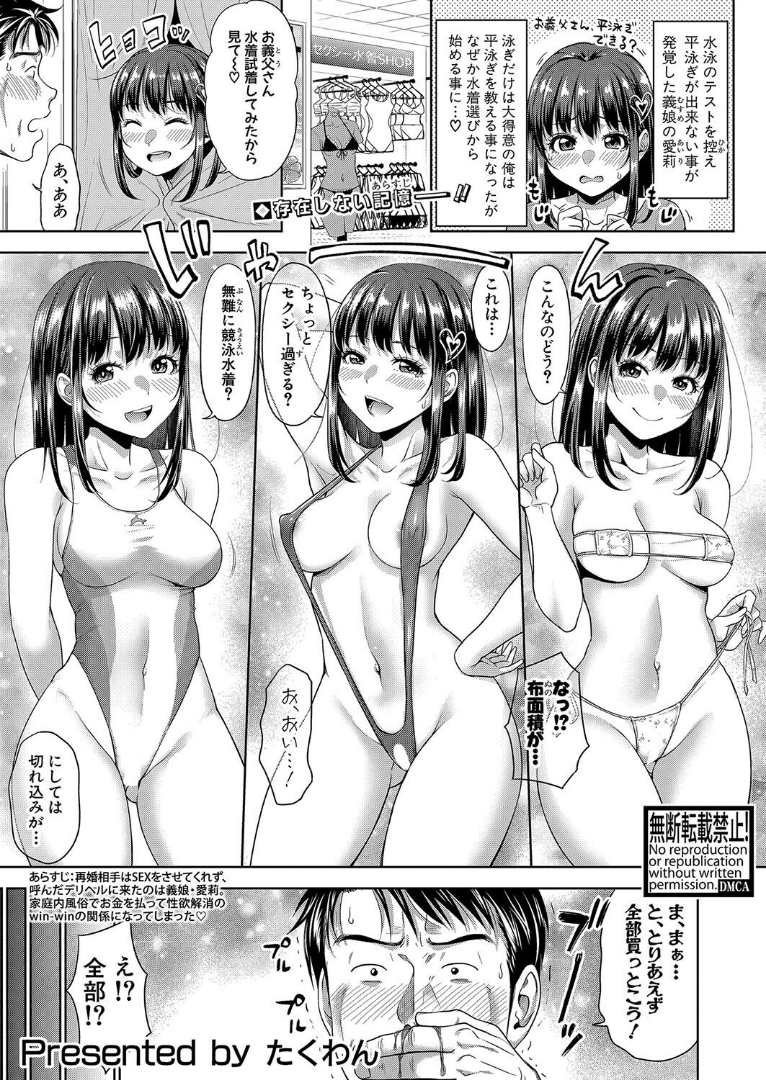 『二人だけの秘密(単話)』を読む ▶妻に隠れて義娘とデリヘルプレイを満喫している父!今日は水泳が苦手な義娘に泳ぎを教えることになったが、布面積極小なエロ水着で誘惑してくる彼女にチ○ポの我慢は限界突破!!貸し切りプールでハメまくる!!