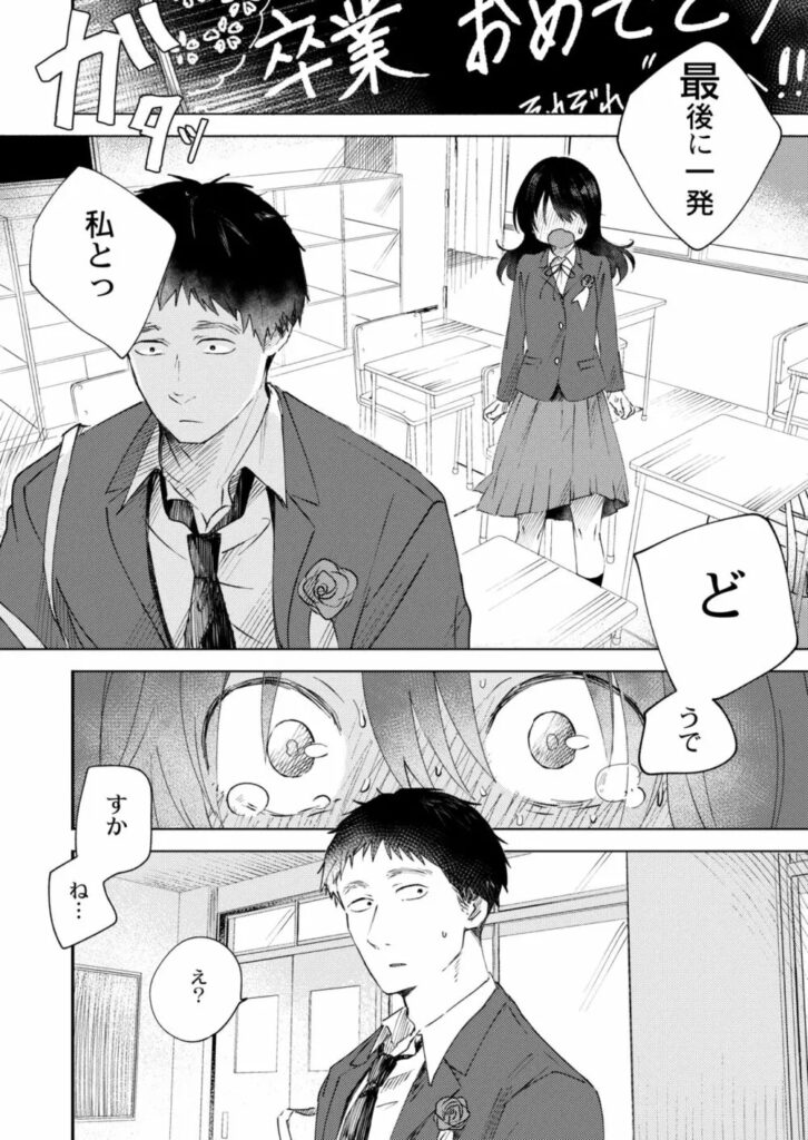 女の子は、ずっと好きだった男の子に最後の勇気を振り絞って告白するんだけど、その告白の仕方が少しユニークなんだ。「最後に一発、私とどうですか?」ってちょっと大胆なセリフでね、彼女の思いが全部詰まってる感じがするの!