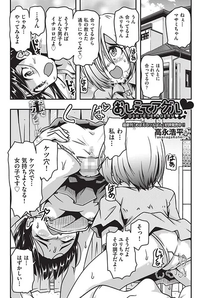 『おしえてアゲル◆(単話)』を読む ▶女友達から恋愛相談を受けた少女。男を射落とすべく指南されたその言葉は…「わ、私はケツ穴で気持ちよくなる女の子です!」とんでもないことを覚えさせられる友達。実はその友達のことが好きだった少女は恋愛成就を阻止すべくわざと間違ったアピール方法を教えているのだった。そうやって過激なポーズを取らせて過激なことを言わせているうちに興奮してきた二人はレズプレイに突入───。そうして気持ち良さも実践したところで、…