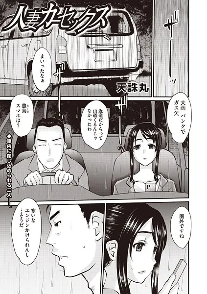 『人妻カーセックス(単話)』を読む ▶大雨の山中で、パンクとガス欠で会社の先輩と車内に閉じ込められたヒロイン。尿意を我慢できず、ペットボトルに放尿するヒロインのエロいお尻に欲情した先輩が欲望のままに襲い掛かる!!