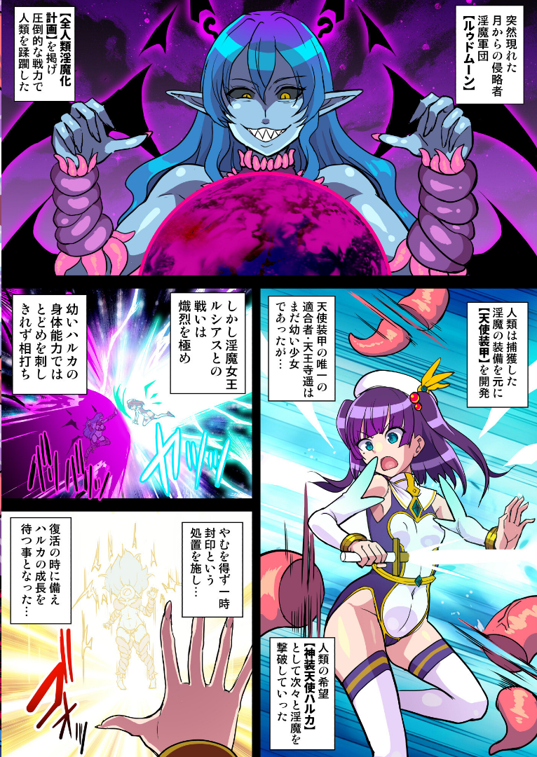 『魔蝕天使ハルカ -触手服の快楽に囚われ堕ちる少女-(単話)』を読む ▶淫魔軍団と戦うため開発された天使装甲を身につけ、かつて自分が封印した淫魔女王ルシアスと再戦する神装天使ハルカ。しかしそれは本来淫魔が身につけていた魔蝕装甲をもとに作られており、6年もの間に思春期を迎えたハルカの強い性欲に反応し触手服へと変化していく。 訓練ばかりで青春を浪費し欲求不満をつのらせていたハルカの願望を魔蝕装甲に読み取られてしまい、的確に性感帯を狙われ何度もイカされてしまう。【全人類淫魔…