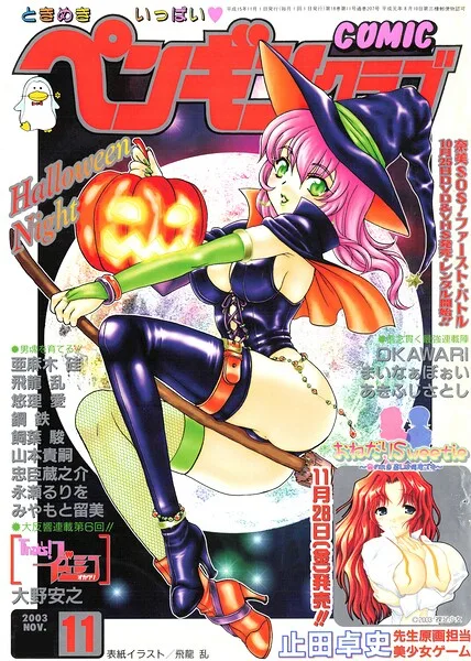 『COMICペンギンクラブ2003年11月号』を読む ▶■収録作品■「COVER ILLUST」飛龍乱「HA-HA-HA」飛龍乱「女の子?」OKAWARI「きっず・とれいん」飼葉駿「OTAKUな妹のいる生活」みやもと留美「花の天然水」永瀬るりを「ぎりぎり!!」鋼鉄「弾 AMMO」山本貴嗣「きょうも元気デス」あきふじさとし「カリーナの冒険」まいなぁぼぉい「ROM」亜麻木硅「DICE!」忠臣蔵之介「That’sイズミコ おかわり」大野安之「モエル」悠理愛