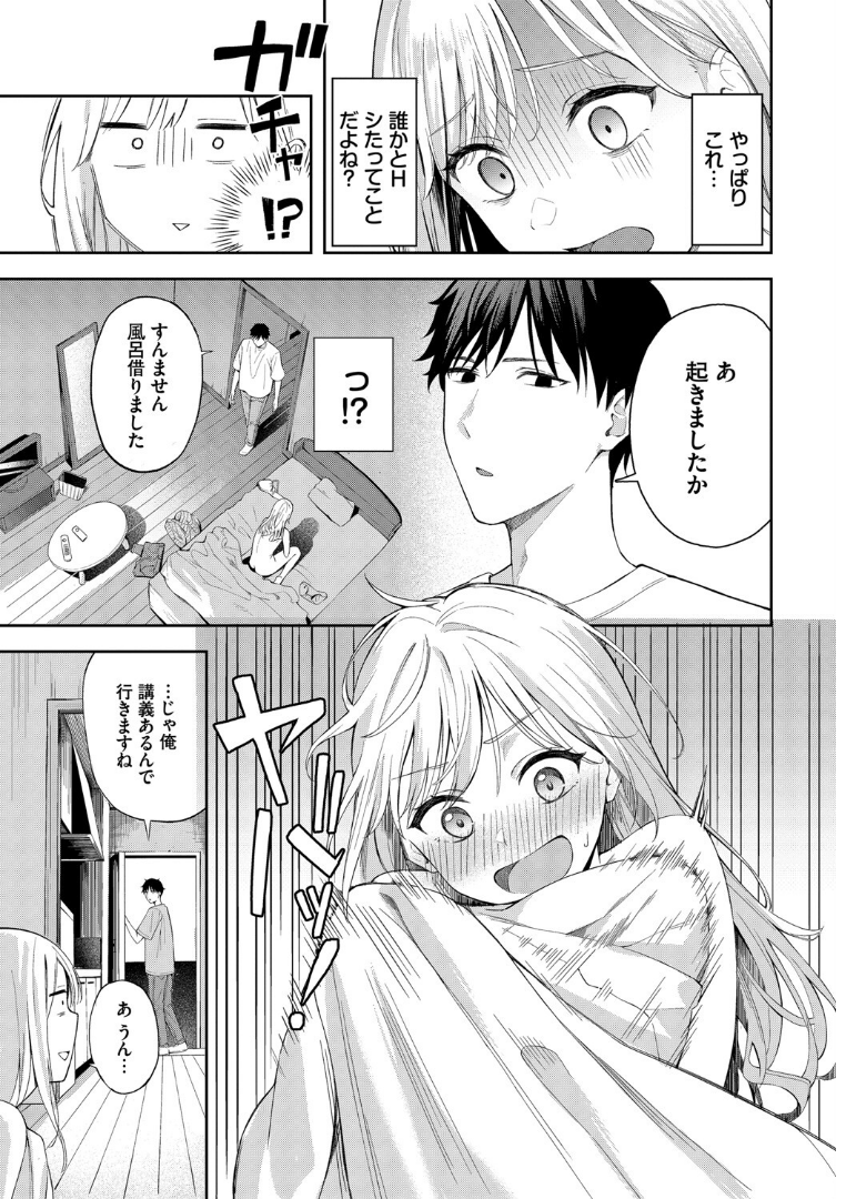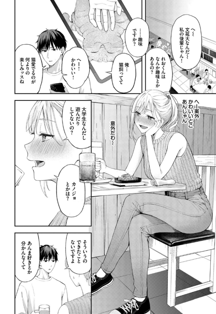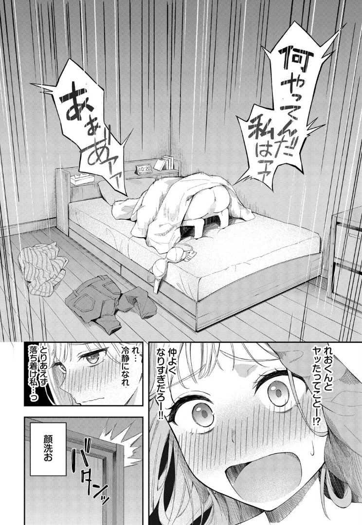 主人公のあきなは、コンビニでバイトしてるオトナギャルなんだけど、寡黙な同僚の男子・れおと飲みに行くの。そのまま朝まで飲み明かしちゃって、翌朝気づいたら二人で朝チュンしちゃってたんだよ〜!