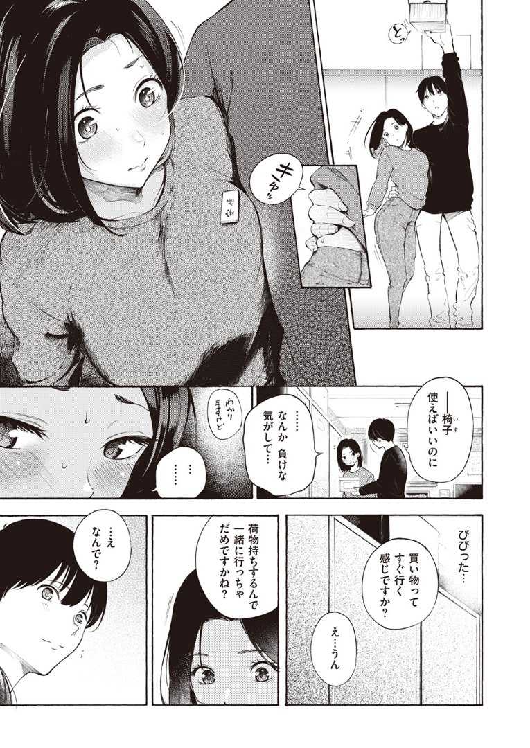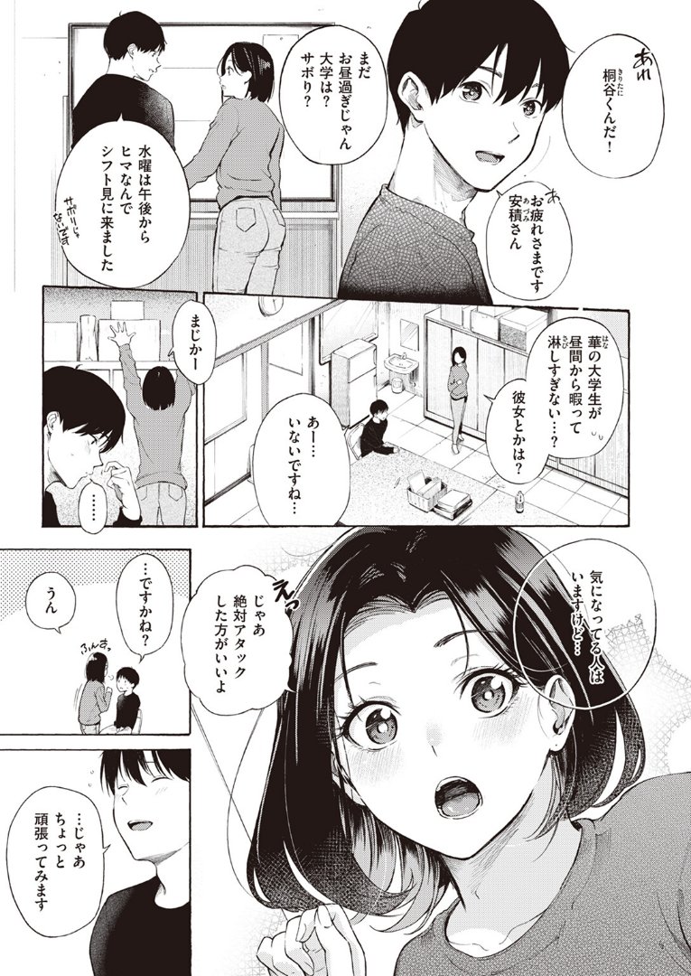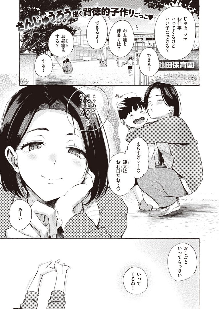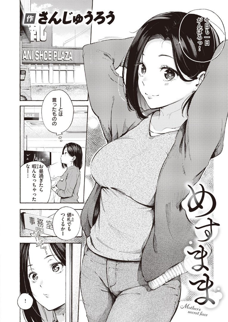 『めすまま(単話)』を読む ▶(男とふたりで買い物とか久々過ぎて――っ めっっっちゃ緊張した……!!)シングルマザーの樹里(じゅり)はある日、勤め先のバイト大学生・桐谷(きりたに)くんにアタックされてしまって……!?久しぶりの男性と二人きりの状況に発情してしまっていた樹里は、カラダを許してしまい……。子供が保育園でいない時間は交尾のチャンス♪