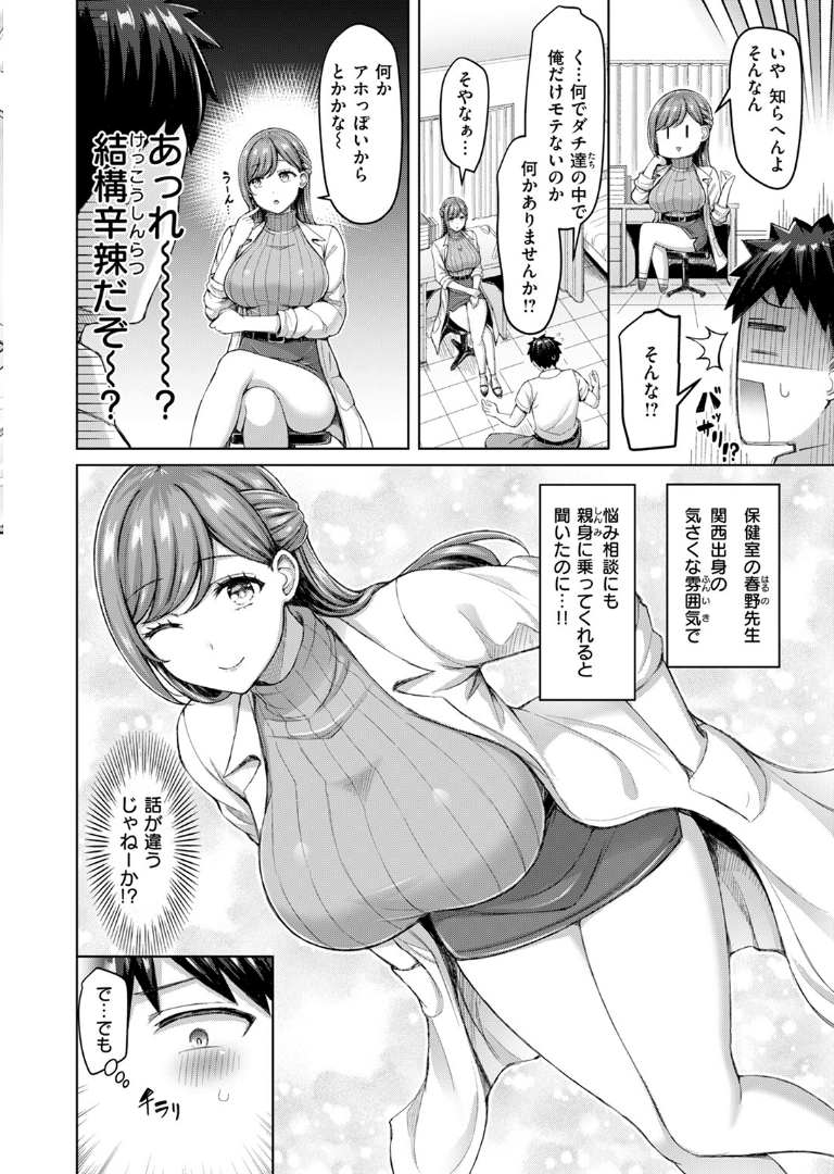 『せんせーが教えたろ☆(単話)』を読む ▶「他ん人には内緒やからね♪」同級生にどんどん彼女ができ始め、焦る佐久間(さくま)は親身に相談に乗ってくれると噂の保健の春野(はるの)先生にどうしたらモテるか聞きに行くことに。最初は辛辣な春野先生だったが、佐久間のために特別授業をしてくれるらしい。とっておきの授業として、春野先生は服を脱ぎ始め……。