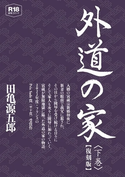 『外道の家【復刻版】』を読む ▶月刊バディ2008年5月号増刊として発行された『外道の家』下巻を復刊2022年度・フランスのPrix Sade賞(サド賞)受賞作入婿の寅蔵は新婚初夜に新妻の眼前で義父に犯●れ、その日から陵●を受け続ける日々に。そして家人も次々に陵●に加わっていく。寅蔵が無限地獄に陥った外道の家の物語。