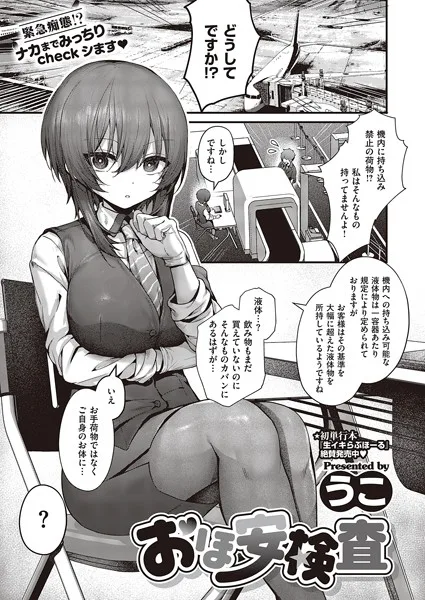 『おほ安検査(単話)』を読む ▶大事なプレゼンがあるのに、搭乗の保安検査で引っかかってしまった!クール系美女の保安官さんが言うには、俺の睾丸にたまった精液が規定値オーバーしているって!?このままでは飛行機に乗れないと焦っていると、保安官さんがバキュームフェラでザーメン搾精…!まだまだ溜まった精液を搾り取るため、おま○こでの中出し搾精にチェンジして♪ハイテンションエロス作家・うこ先生熱筆!! デカパイ巨乳保安官にナカまでみっちりチ…